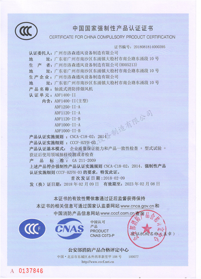 • CCCF證書-洛森風機180314離心式消防排煙風機SDZ1000F-II(SDZ1000F-II~SDZ500F-II-E)